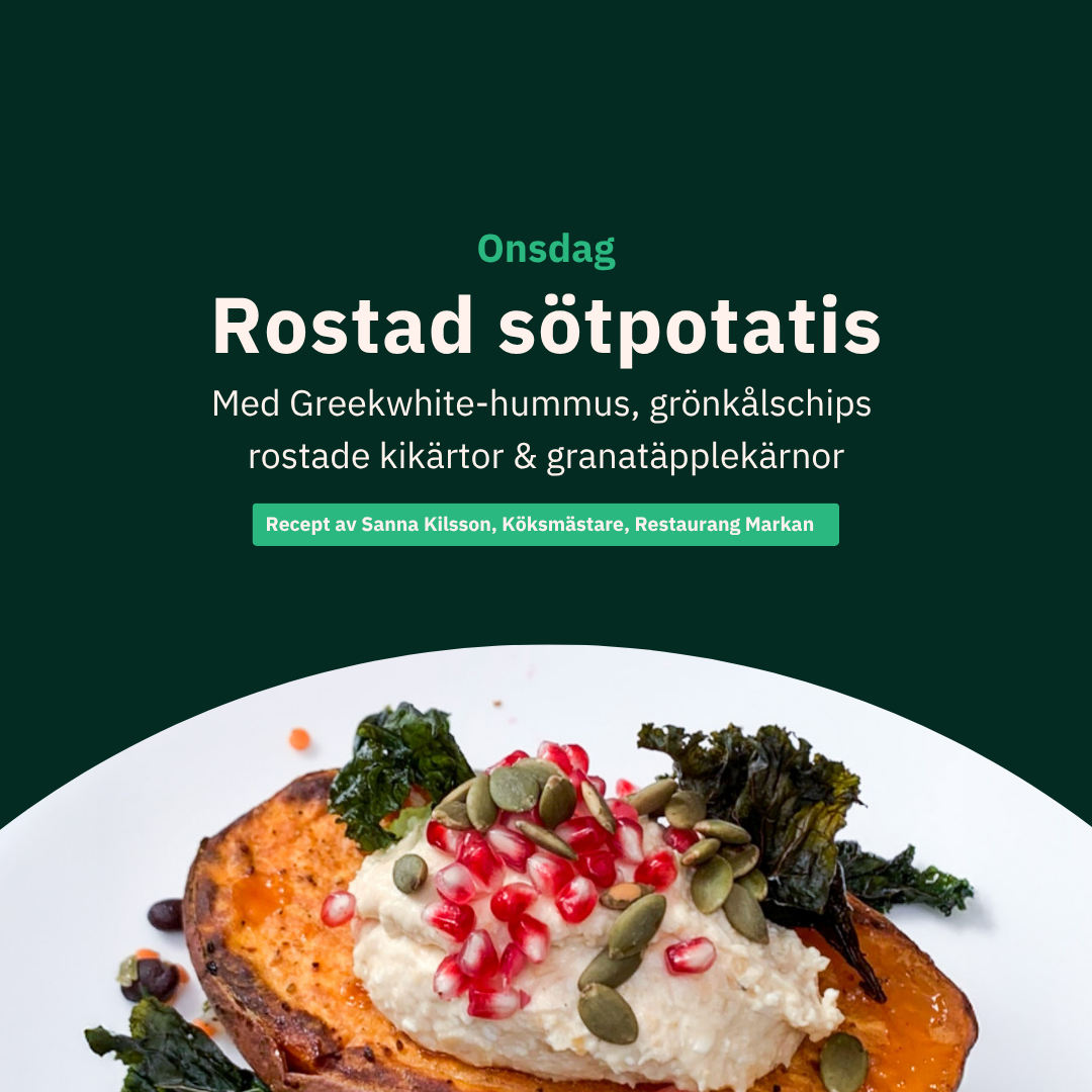 – Det är en rätt som vi lagat i många år. Här på Markan inspireras vi av olika matkulturer och gillar att kombinera texturer, smaker och säsongsråvaror. Sötpotatisen ger sötma och fyllighet, grönkålschipsen ger krisp, och hummusen är både krämig och proteinrik tack vare kikärtor och vegansk Greek white-ost.