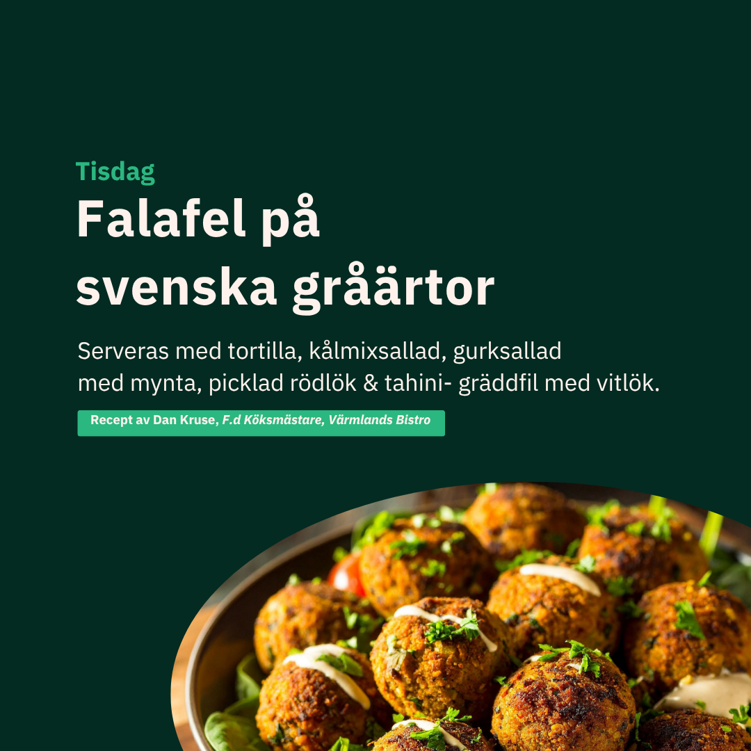 – Dan Kruse, som tidigare var köksmästare hos oss, tog fram receptet. Han inspirerades av svenska råvaror och ville skapa något som var gott och annorlunda. Falafel är en rätt som många känner igen, men här sätts gråärtan, en svensk proteinkälla i fokus.